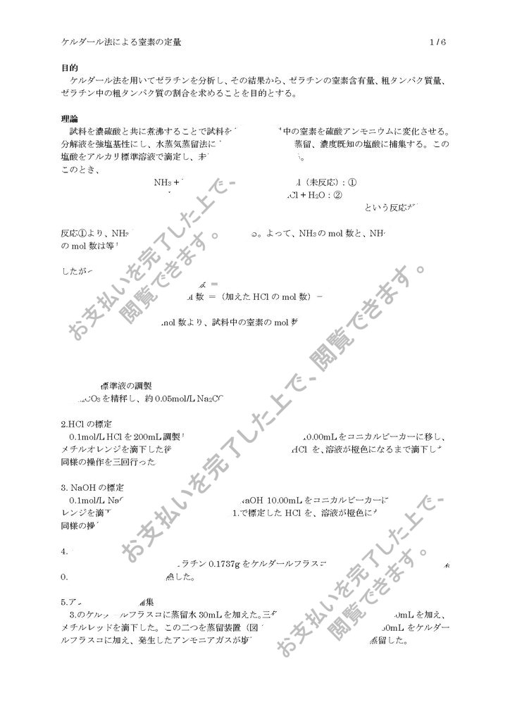 について考察を行うことを目的とする。 42 全窒素の分析(ケルダール法) 原 理 含窒素化合物の一定量を濃硫酸とともに強熱・分解し、硫酸アンモニウムに変える。分解に際しケルダール法を用いてゼラチンを分析し、その結果から、ゼラチンの窒素含有量、粗タンパク質量、ゼラチン中の粗タンパク質の割合を求めることを目的とする。 理論 操作 結果 考察 タンパク質含有率の誤差に関する考察 課題 ①窒素係数625のタンパク質の窒素含有率 ②水蒸気蒸留の原理ケルダール法の計算の質問です。 分かる方がいましたら、解説お願いします。 試料 gを秤取し、ケルダールフラスコ内にて、濃硫酸25 ml,触媒5 gを入れ加熱分解した。分解液を0 mLに メスアップした希